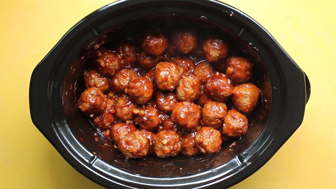 Grab a bag of frozen meatballs, barbecue sauce, and grape jelly. Dump it all in the slow cooker and let it go for a few hours until everything’s coated and sticky.