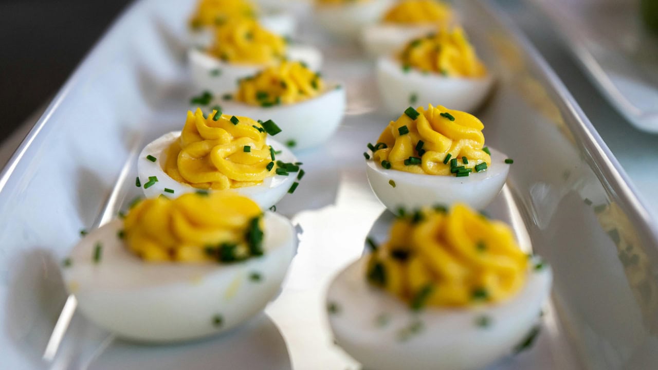A dozen eggs, mayo, mustard, and a little seasoning—nothing fancy. Boil, peel, slice, and mash the yolks with your mix-ins before piping them back in.