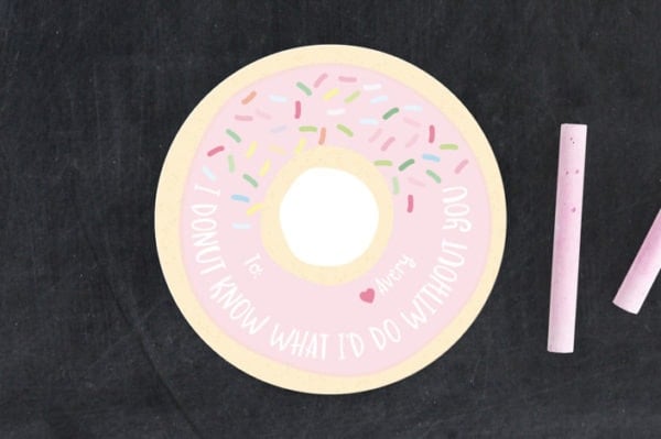 Another great option for young ones! This classroom Valentine features a die cut circle in the shape of a donut. It has accompanying playful fonts and a punny message.